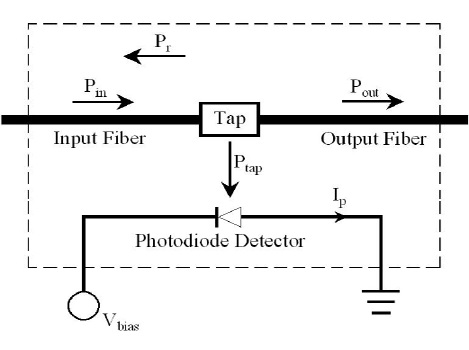 The core of the technology (GR-468 Telecordia Qualified) is an integrated optical tap and photodiode (see figure below) based on patented technology, which measures power within an optical fiber.